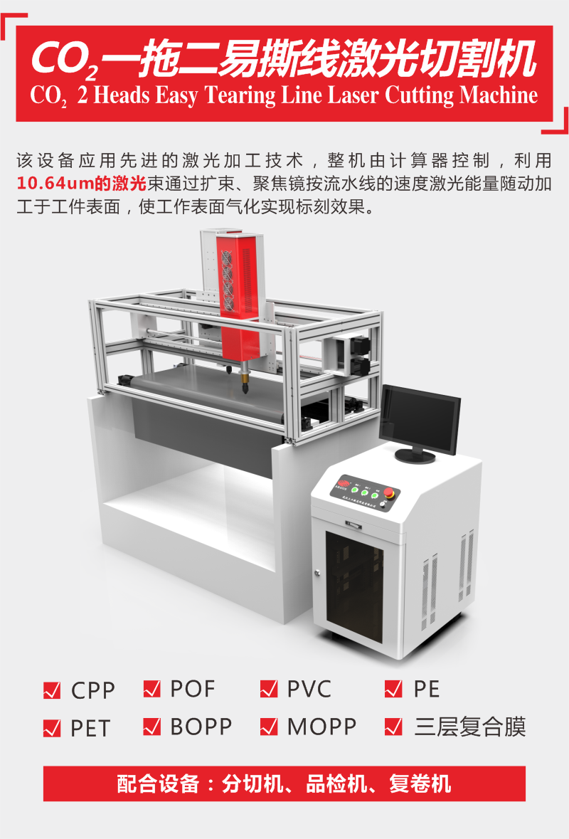 該設(shè)備適用于食品印刷包裝、飲料熱封標(biāo)簽、醫(yī)藥外包、日用化妝品、收縮膜等多種薄膜行業(yè)的定量透氣孔、易撕口、熱封標(biāo)簽激光標(biāo)刻。