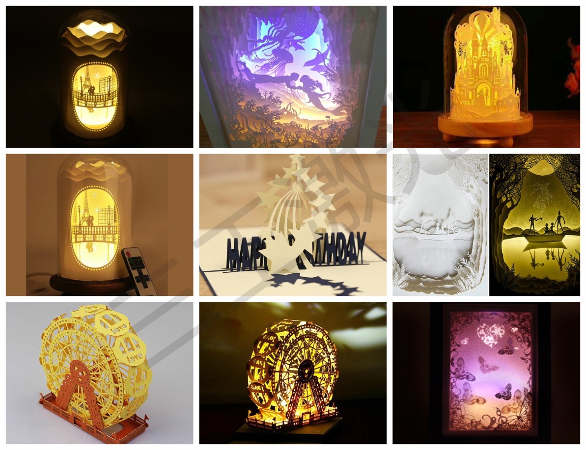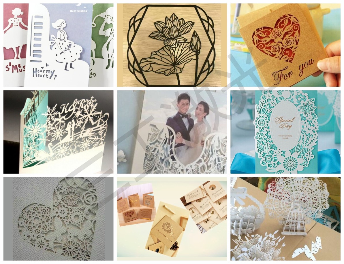 該設(shè)備適用于賀卡、年畫、喜帖、月餅盒、糖盒、剪紙、3D紙雕燈、請柬、蛋糕圍邊、席位卡杯卡、繪畫模板、文創(chuàng)工藝品等多種紙質(zhì)材料以及PET材料的雕刻、切割、鏤空制作。